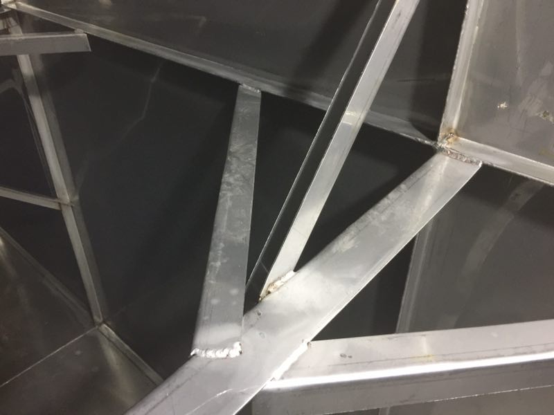 斜拉主要的作用在于分擔主拉筋的拉力,進一步對水箱板進行穩(wěn)固,切成500mm的長度,連接在水箱與主拉之間。形成龍爪式,常規(guī)尺寸為4cm*1cm厚度一般以靠近頂部的側(cè)板厚度為基準,連接處必須進行滿焊處理。