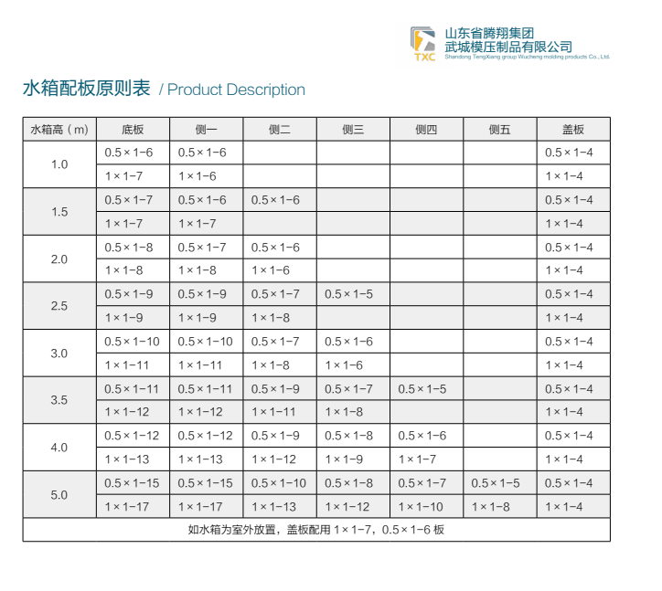 水箱配板原則表都有一個(gè)大概的行業(yè)標(biāo)準(zhǔn),大部份的廠家會(huì)遵循這個(gè)標(biāo)準(zhǔn)來(lái)制作消防水箱,以下是山東騰翔集團(tuán)的水箱配板原則表: